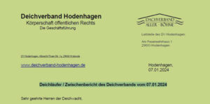 Zwischenbericht des Deichverbands vom 06.01.2024, 21:00 Keine akuten Auffälligkeiten/Probleme. THW, DLRG, Feuerwehren deutlich reduziert Deiche unveränderter, stabiler Zustand Die Zuflüsse laufen mit geringfügig sinkendem Pegel ab. Die Niederschläge sind im Verhältnis mäßig gewesen und infolge der flächigen Ausbreitung der Aller ist derzeit kaum eine Änderung zu beobachten. Der Pegel Aller verharrt bei 4,30 m und […]